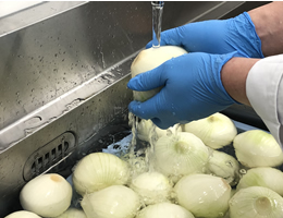 検収室でチェックされた材料等を更に土由来の微生物、虫、異物を落とすために専用のシンクで十分にすすぎ洗いを施し、調理するだけの状態に持って行きます。